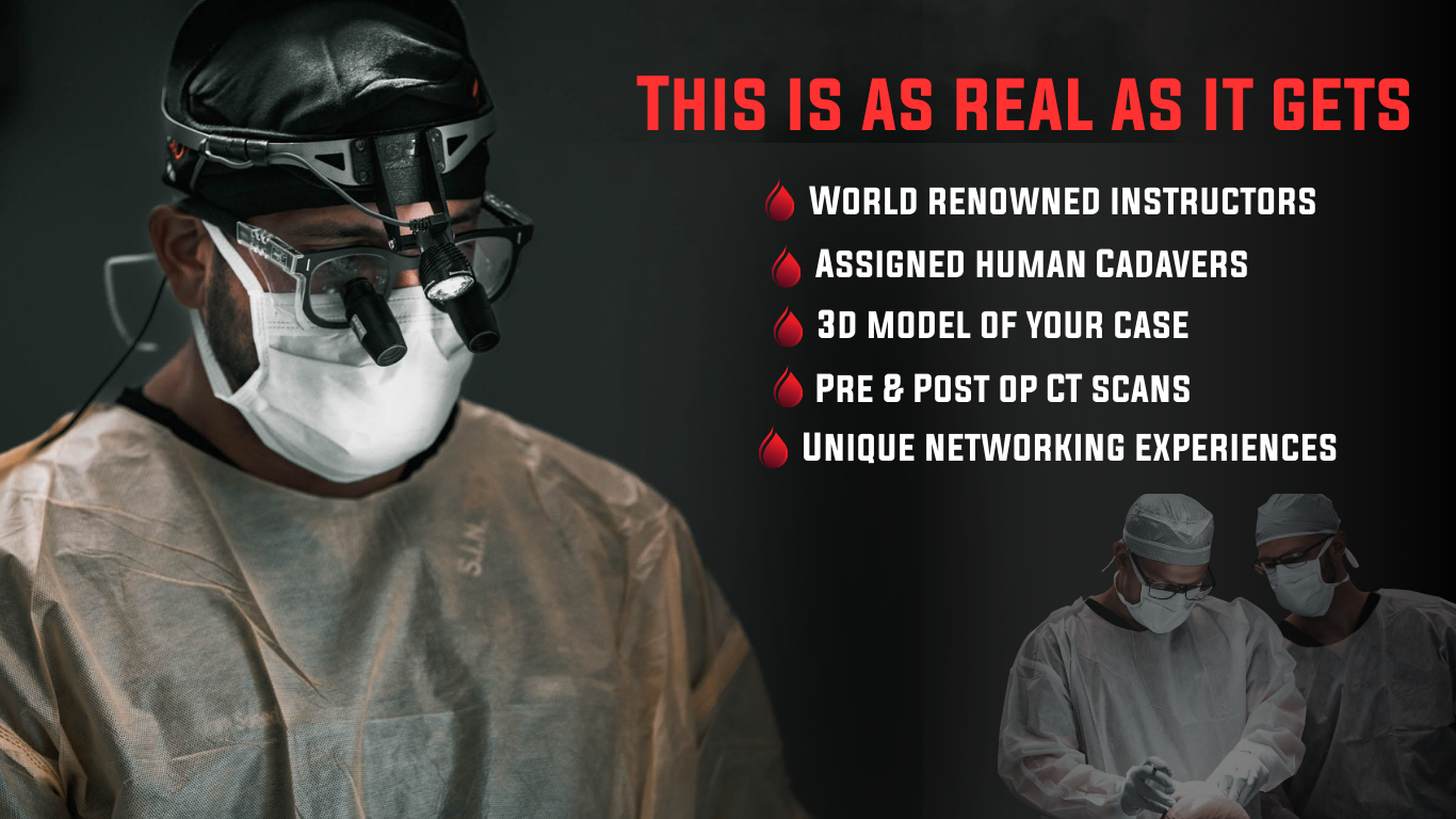 Begin with in-depth didactic training on the app, featuring step-by-step surgical videos and hours of full cases from start to finish. As you advance, you’ll earn your rank with exclusive patches, scrub caps, and challenge coins that mark your progression. And when it’s time to move from screen to scalpel, your online training unlocks exclusive discounts on our unmatched in-person cadaver experiences—complete with assigned cadavers, pre- and post-op CT scans, and 3D printed models of your case.
